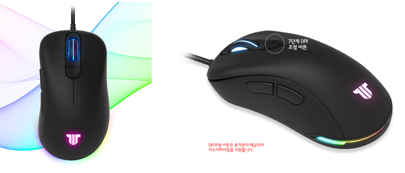 DPI는 마우스 상단에 조절할 수 있는 버튼이 있어 최대 7단계까지 조절이 가능하며, 버튼도 추가로 제공해 커스터마이징도 가능하다.