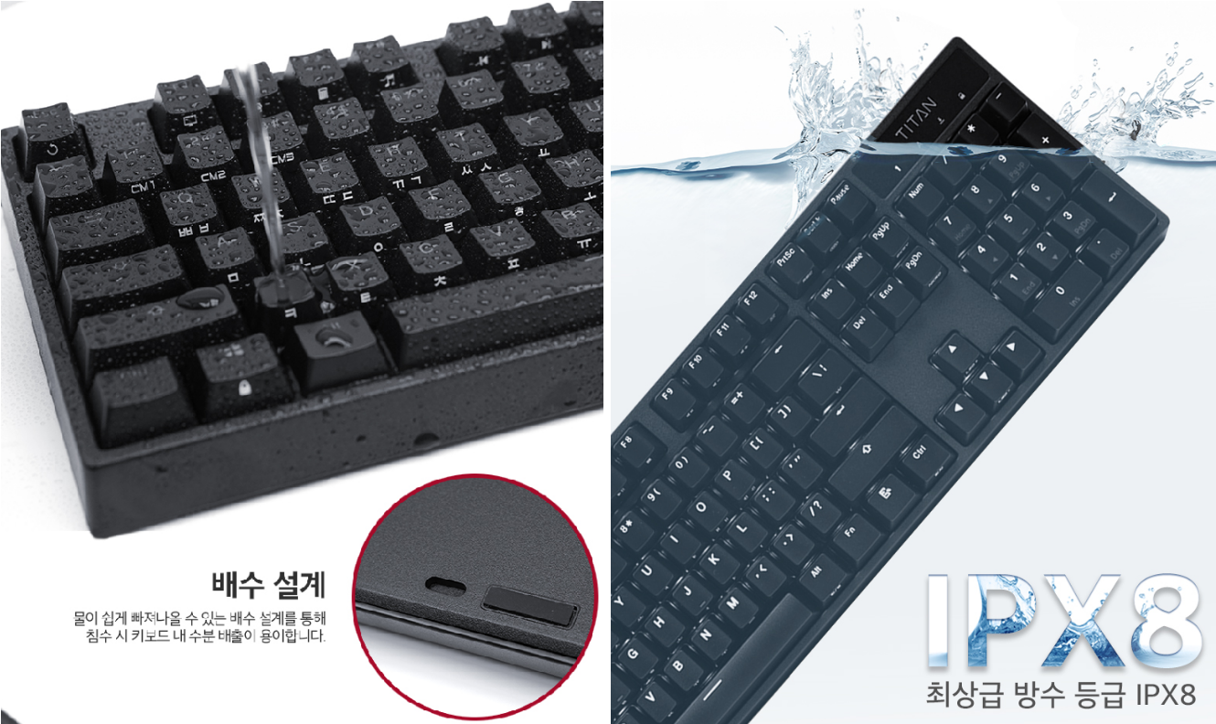 키보드를 사용하다 보면 실수로 물이나 음료를 쏟는 경우가 있는데, 제닉스 타이탄 옵티컬 V2 키보드는 최상급 방수 등급인 IPX8로 수심 1m 깊이에도 무리없이 작동하는 강력한 방수 성능을 지원한다고 한다.