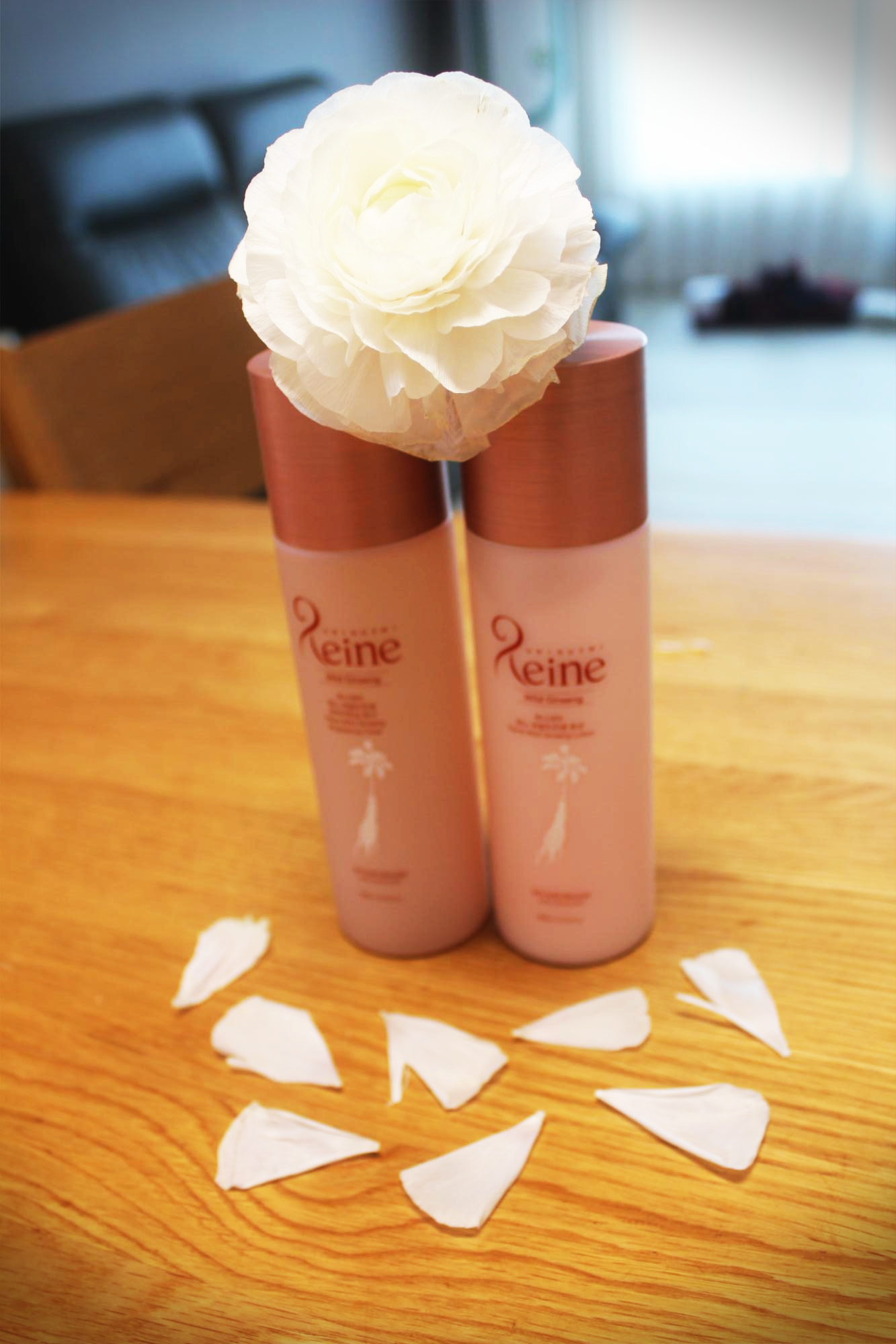 구입한 렌느 스킨케어 제품은 와일드진생 로션과 브라이트닝 토너로, 핑크와 주황색이 섞인 듯 자홍색??의 유리 용기에 담겨 있었다.