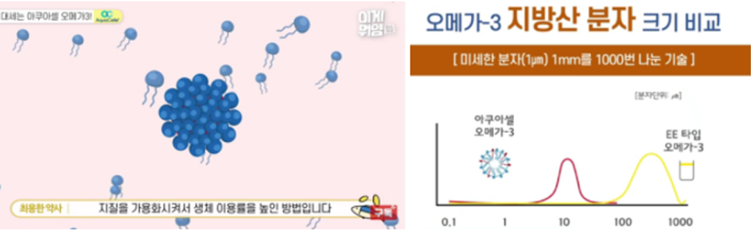 쉽게 말하자면, 오메가3 지방산을 1mm라고 하면 이 1mm를 1,000 조각으로 나눈 저분자 오메가3로 흡수를 높이려고 한 것으로 이해하면 된다. 1mm를 1,000번 나눈 크기의 아쿠아셀 오메가3는 기능성 원료 EPA 및 DHA 함유 유지 인체시험 결과, 흡수율이 6배 높다라는 유의적인 차이까지 확인했다고 한다.(EE형 대비)